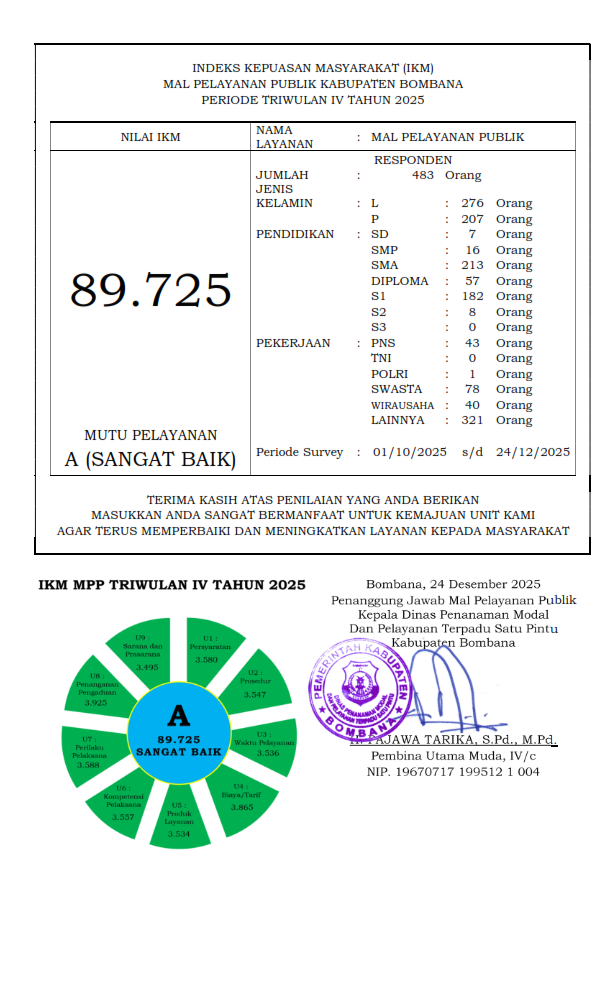 Hasil Indeks Kepuasan Masyarakat (IKM) atas Penyelenggaraan Pelayanan Publik pada Mal Pelayanan Publik Kab. Bombana Triwulan IV Tahun 2025