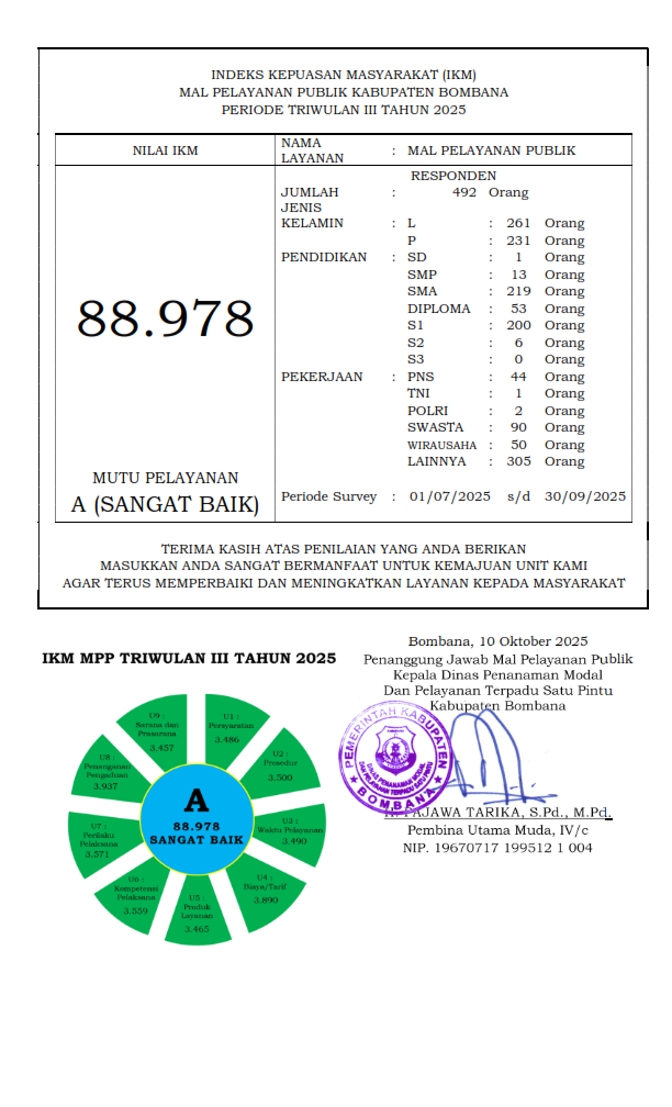 Hasil Indeks Kepuasan Masyarakat (IKM) atas Penyelenggaraan Pelayanan Publik Pada Mal Pelayanan Publik Kab. Bombana Triwulan III Tahun 2025 yang dilakukan pada tanggal 1 Juli 2025 sampai 30 September 2025,