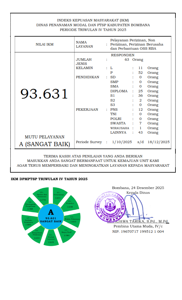 Hasil Indeks Kepuasan Masyarakat (IKM) atas Penyelenggaraan Pelayanan Publik Dinas Penanaman Modal dan PTSP Kab. Bombana Triwulan IV Tahun 2025 yang dilakukan pada tanggal 1 Oktober 2025 sampai 18 Desember 2025,